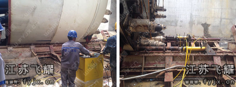 本次盾構機組裝使用江蘇飛耀的多臺雙作用液壓千斤頂以及一臺同步電動液壓泵站。主要工作是將盾構機的機頭和控制器相連。因盾構機機身龐大,有100米之長,采用分段下井法,講其一段一段下放至井底的鐵軌,并按照順序使用兩臺雙作用液壓千斤頂將其逐個推進涵洞,并在洞內進行組裝。本次工程要求單次頂推行程稍大,保持整個過程平穩頂推。作為國內液壓工具龍頭企業,我們很成熟的方案。施工時,飛耀工程人員也抵達現場對現場施工人員進行指導培訓,使整個工程順利的展開。